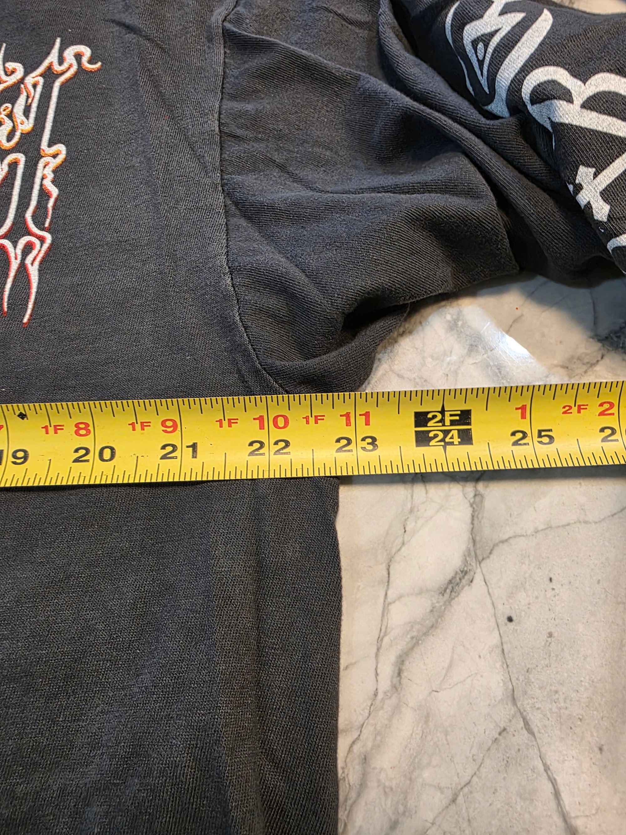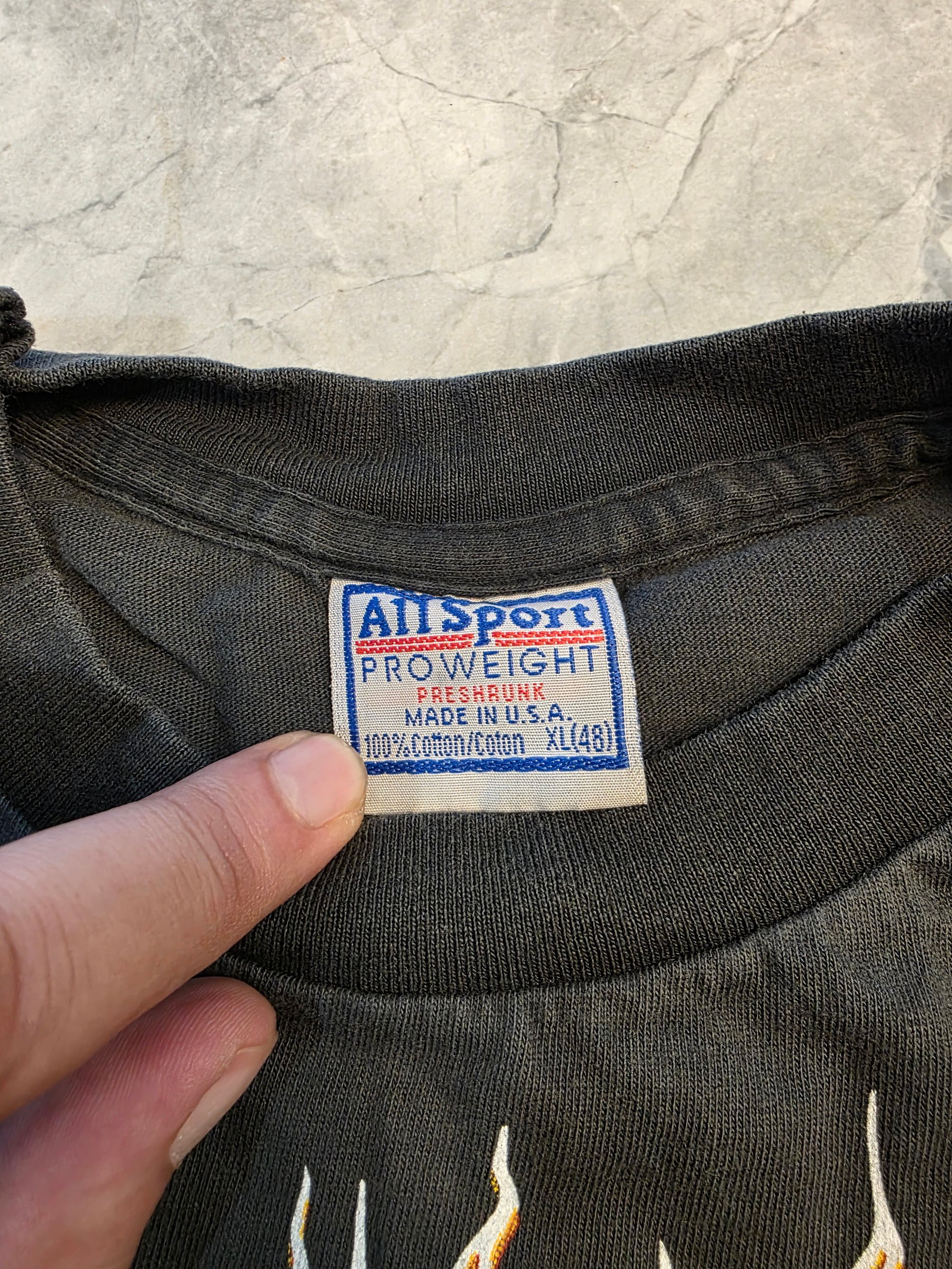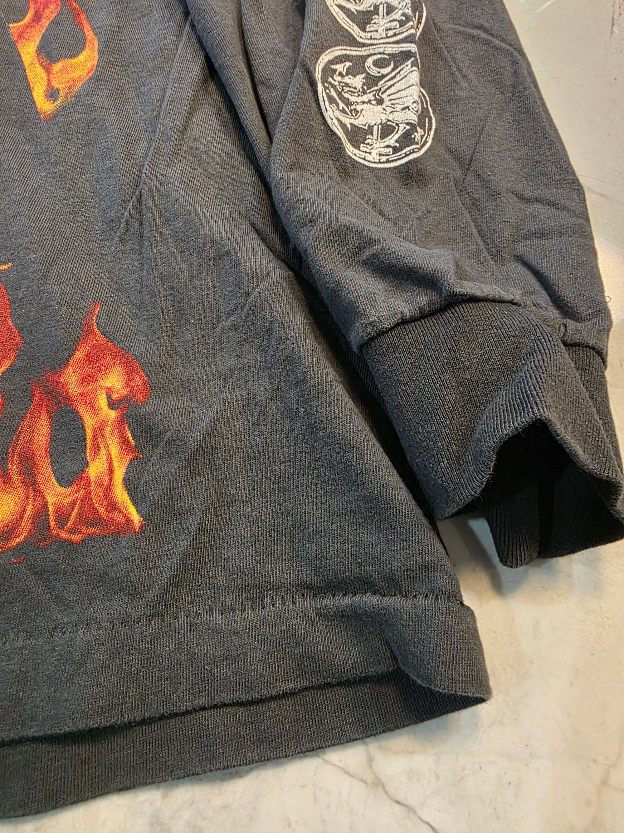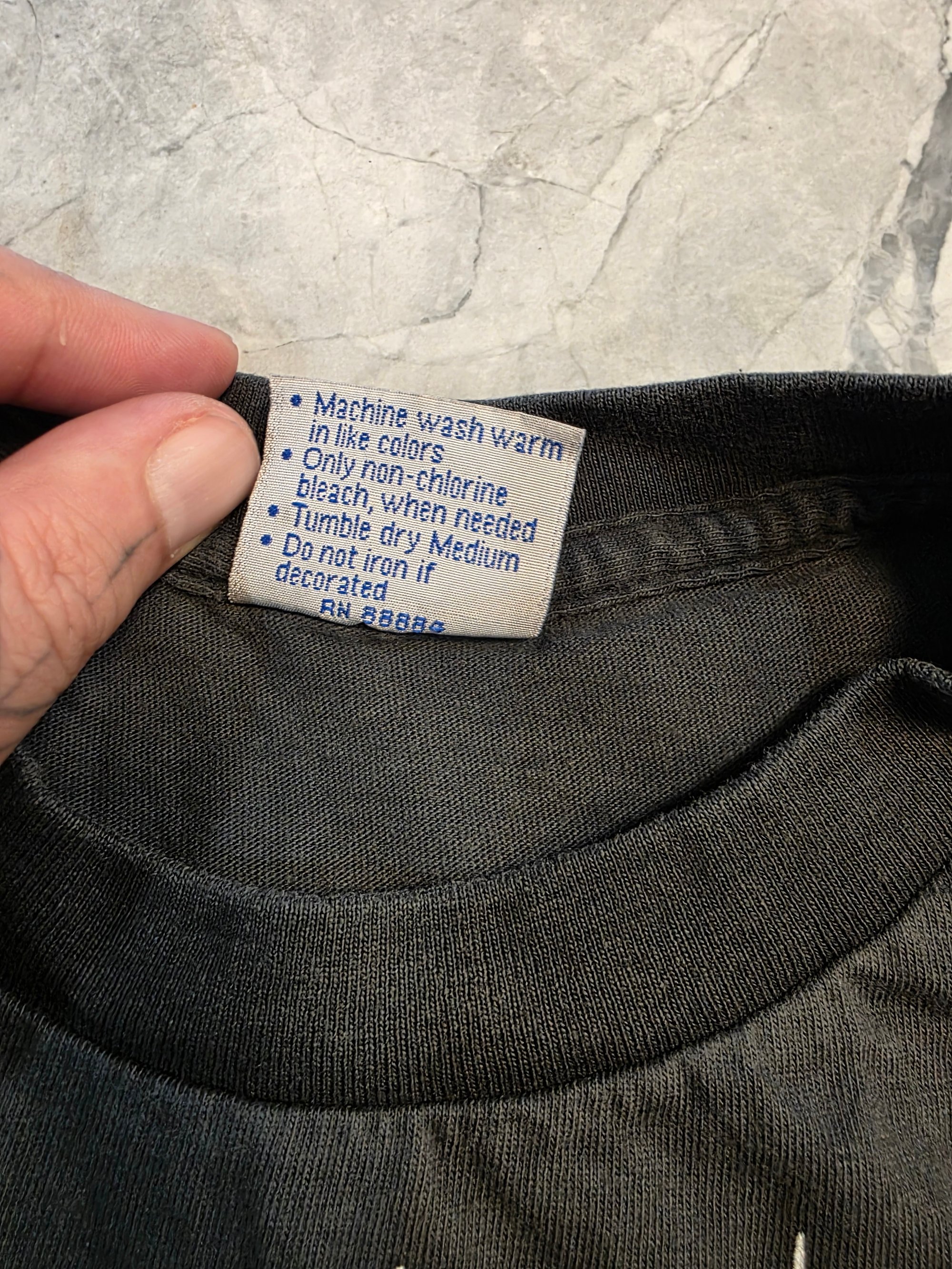 On a soft and faded retro single stitch long sleeve.