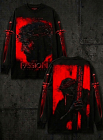 Design: Custom-designed "The Passion of the Christ" long-sleeve tee. Features a high-contrast red and black graphic of Jesus with the crown of thorns on the front.